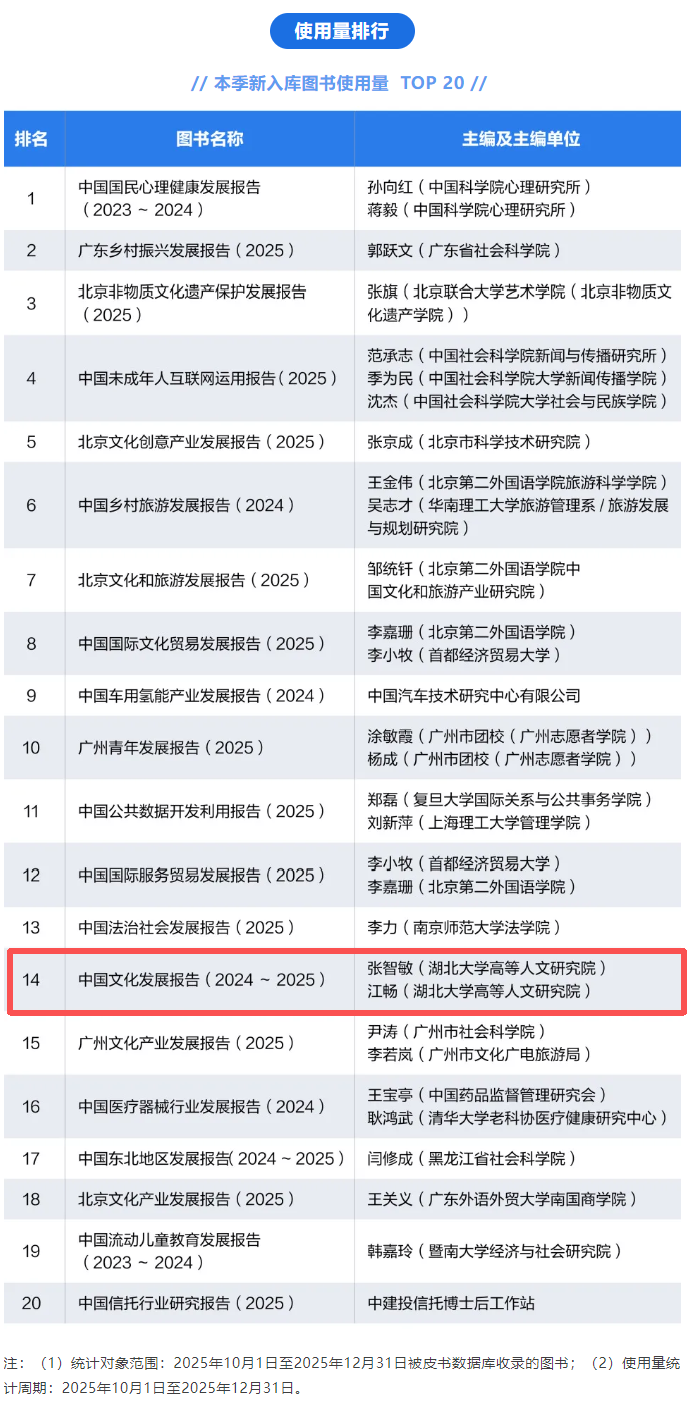 近日,社会科学文献出版社发布《2025年第四季度皮书数据库影响力报告》,由湖北大学高等人文研究院组织研创的《中国文化发展报告(2024~2025)》进入新入库图书使用量TOP20。体现了学界与社会各界对中国文化发展研究的密切关注,彰显了该书在学术研究与社会应用领域的广泛影响力。